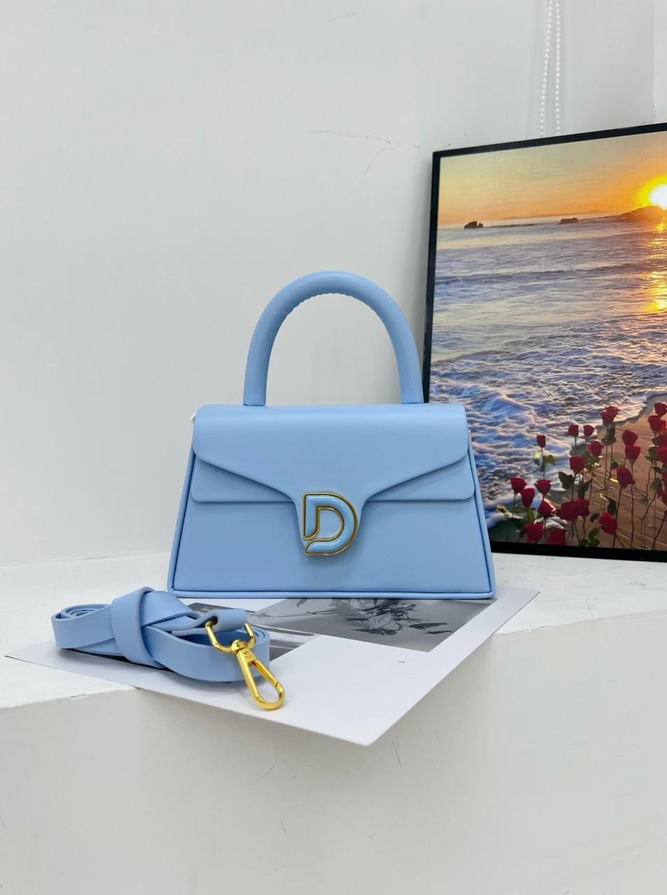 This stylish handbag is presented in a delicate , offering a fresh and elegant aesthetic. It boasts a classic top handle design and a structured silhouette. The focal point of the bag is the polished gold-toned "D" initial on the front flap, adding a touch of personalized luxury. The bag also comes with a detachable light blue shoulder strap with gold clasps, providing versatility in carrying options. Perfect for adding a subtle pop of color and refined detail to any outfit in Nairobi.